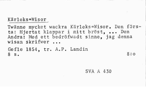 //// Kärleks=Wisor //// Twänne mycket wackra Kärleks =Wisor. Den första: Hjertat klappar i mitt bröst, ... Den Andra: Med ett bedröfwadt sinne, jag denna wisan skrifwer ... //// Gefle 1854, tr. A.P. Landin 8 s. 8:0 //// SVA A 430 ////