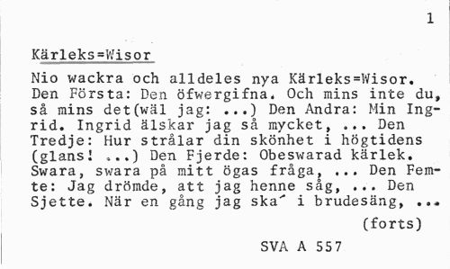 //// Kärleks=Wisor //// Nio wackra och alldeles nya Kärleks=Wisor, Den Första: Den öfwergifna. Och mins inte du, så mins det(wäl jag: ...) Den Andra: Min Ingrid. Ingrid älskar jag så mycket, ... Den Tredje: Hur strålar din skönhet i högtidens (glans! *..) Den Fjerde: Obeswarad kärlek. Swara, swara på mitt ögas fråga, ... Den Femte: Jag drömde, att jag henne såg, ... Den Sjette. När en gång jag ska' i brudesäng, ... //// (forts) //// SVA A 55 7 ////