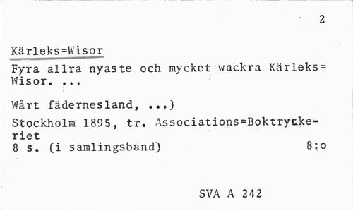 //// 2 //// Kärleks=Wisor //// Fyra allra nyaste och mycket wackra Kärleks= Wisor. ... //// Wårt fädernesland, ,..) //// Stockholm 1895, tr. Associations=BoktrycJke-riet //// 8 s. (i samlingsband) 8:o //// SVA A 242 ////