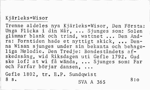 //// Kjärleks=Wisor //// Trenne aldeles nya Kjärleks=Wisor, Den Första: Unga Flicka i din V/år, ... Sjunges som: Solen glimmar blank och trind, watcnet ... Den Andra: Forntiden hade et nyttigt skick, ... Denna Wisan sjunges under sin bekanta och behageliga Melodie. Den Tredje: Bondeståndets af-skedssång, wid .Riksdagen uti Gefle 1792. Gud ske lofJ at wi få wända, ... Sjunges som: Far och Farfar börjar dansen, ... //// Gefle 1802, tr. E.P. Sundqwist //// 8 s> SVA A 365 8:0 ////