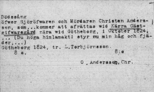 //// Dödssång //// öfwer Sjöröfwaren och Mördaren Christen Andersson, som...kommer att afrättas wid Kärra Gäst-Kifwareg&rd rära wid Göthetorg, i ^foTser .t* l^uhlga himlamakt'1 styr nu min håg och fjäder,...) //// Gctheborg 1824, tr. L.Torbjörrsson. //// 8 a. 8:o //// 0 . Anderssoj), Chr". ////