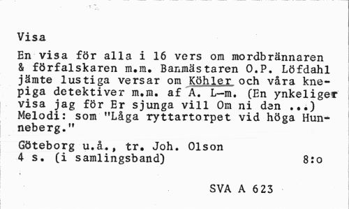 //// Visa //// En visa för alla i 16 vers om mordbrännaren & förfalskaren m.m. Banmäståren O.P. Löfdahl jämte lustiga versar om Köhler och våra kne-piga detektiver m.m. af A. L-m. (En ynkeliger visa jag för Er sjunga vill Om ni den ...) Melodi: som "Låga ryttartorpet vid höga Hunneberg." //// Göteborg u.å., tr. Joh. Olson 4 s. (i samlingsband) 8:0 //// SVA A 6 23 ////
