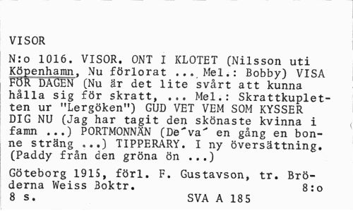//// VISOR //// N:o 1016. VISOR. ONT I KLOTET (Nilsson uti Köpenhamn, Nu förlorat ... Mel.: Bobby) VISA F5R~DAGEN (Nu är det lite svårt att kunna hålla sig för skratt, ... Mel.: Skrattkupletten ur "Lergöken") GUD VET VEM SOM KYSSER DIG NU (Jag har tagit den skönaste kvinna i famn ...) PORTMONNÄN (De*va' en gång en bonne sträng ...) TIPPERARY. I ny översättning. (Paddy från den gröna ön ...) //// Göteborg 1915, förl. F. Gustavson, tr. Bröderna Weiss Boktr. 8:0 8 s. SVA A 18 5 ////