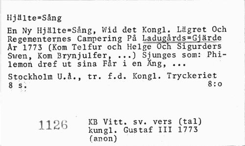 //// Hjälte=Sång //// En Ny Hjälte=Sång, Wid det Kongl. Lägret Och Regementernes Campering På Ladugårds=Gjärde Är 1773 (Kom Telfur och Helge Och Sigurders Swen, Kom Brynjulfer, ...) Sjunges som: Phi-lemon dre£ ut sina Får i en Äng, ... //// Stockholm U.å., tr. f.d. Kongl. Tryckeriet 8 s. 8:0 //// a i ol» KB Vitt. sv. vers (tal) J kungl. Gustaf III 1773 (anon) ////