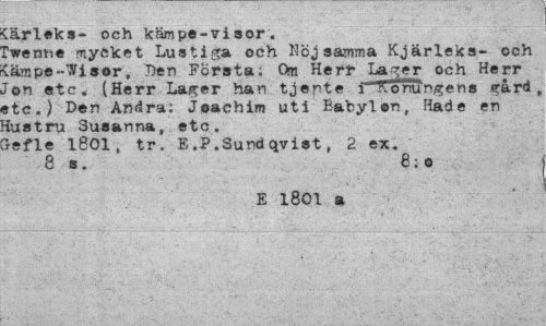 //// [ärleks- och kämpe-visor. //// rwemie mycket Lustiga och Höj samma Kjärleks- och tämpe-Wiser, Den Första; Om Herr La?er och Herr fon etc. (Herr La^er han tjente r honungens gård, stc.) Den Andra: Joachim uti Babylen, Hade en iuatru Susanna, etc. refle 1801, tr. E.P.Sundqvist, 2 ex. //// 8 s. 8:o //// E 1801 a ////