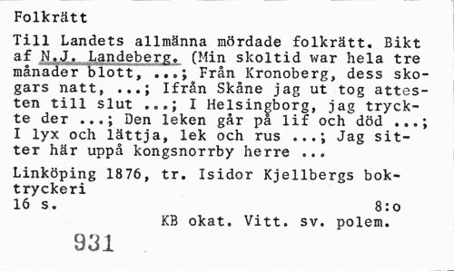 //// Folkrätt //// Till Landets allmänna mördade folkrätt. Bikt af N.J. Landeberg. (Min skoltid war hela tre månader blott. .7 .; Från Kronoberg, dess skogars natt, ...; Ifrån Skåne jag ut tog attesten till slut ..,»; I Helsingborg, jag tryckte der Den leken går på lif och död I lyx och lättja, lek och rus ...i Jag sitter här uppå kongsnorrby herre ... //// Linköping 1876, tr. Isidor Kjellbergs boktryckeri //// 16 s. 8:o //// KB okat. Vitt. sv. polem. //// 931 ////