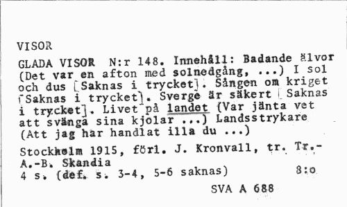 //// VISOR //// GLADA VISOR N:r 148. Innehåll: Badande älvor (Det var en afton med solnedgång, ...) I sol och dus [Saknas i trycket]. Sången om kriget fSaknas i trycket). Sverge är säkert i. Saknas i trycket]. Livet på landet. {Var jänta vet att svänga sina kjolar .,.) Landsstrykare (Att jag har handlat illa du ...) //// Stockkelm 1915, förl. J. Kronvall, tr. Tr.-A.-B. Skandia //// 4 s^ (déf. s. 3-4, 5-6 saknas) 3:o //// SVA A 688 ////