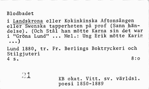 //// Blodbadet //// i Landskrona eller Kokinkinska Aftonsången eller Swenska tapperheten på prof (Sann händelse) . (Och Stål han mötte Karna sin det war i "Gröna Lund" ... Mel.: Ung Erik mötte Karin //// Lund 1880, tr. Fr. Berlings Boktryckeri och Stilgjuteri //// 4 s. 8:0 //// 43 KB okat. Vitt. sv. världsl, //// poesi 1850-1889 ////