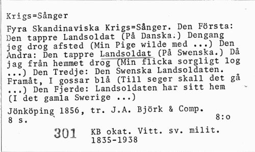 //// Xrigs=Sånger //// Fyra Skandinaviska Krigs = Sånger. Den Första: Den tappre Landsoldat (På Danska.) Dengang jeg drog afsted (Min Pige wilde med ...) Den^ ! Andra: Den tappre Landsoldat (På Swenska.) Då jag från hemmet drog (Min flicka sorgligt log ...) Den Tredje: Den Swenska Landsoldaten. Framåt, I gossar blå (Till seger skall det gå ...) Den Fjerde: Landsoldaten har sitt hem (I det gamla Swerige ...) //// Jönköping 1856, tr. J.A. Björk & Comp. 8 s. 1 8:o //// 3Q1 KB okat. Vitt. sv. milit. //// 1835-1938 ////