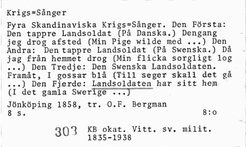 //// Krigs=Sånger //// Fyra Skandinaviska Krigs=Sånger. Den Första: Den tappre Landsoldat (På Danska.) Dengang jeg drog afsted (Min Pige wilde med ...) Den Andra: Den tappre Landsoldat (På Swenska.) Då jag från hemmet drog (Min flicka sorgligt log ...) Den Tredje: Den Swenska Landsoldaten. Framåt, I gossar blå (Till seger skall det gå ...) Den Fjerde: Landsoldaten har sitt hem (I det gamla Swerige ...)...~ //// Jönköping 1858, tr. O.F. Bergman 8 s. 8:0 //// onn KB okat. Vitt. sv. milit. //// OU^ 1835-1938 ////