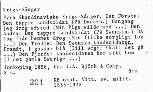 //// Krigs=Sånger //// Fyra Skandinaviska Krigs=Sånger. Den Första: Den tappre Landsoldat (På Danska.) Dengang jeg drog afsted (Min Pige wilde med ...) Den^ Andra: Den tappre Landsoldat (På Swenska.) Då jag från hemmet drog (Min flicka sorgligt log ,..) Den Tredje: Den Swenska Landsoldaten. Framåt, I gossar blå (Till seger skall det gå ...) Den Fjerde: Landsoldaten har sitt hem (I det gamla Swerige ...) //// Jönköping 1856, tr. J.A. Björk & Comp. 8 s. " 8:0 //// onn KB okat. Vitt. sv. milit. //// OU^ 1835-1938 ////
