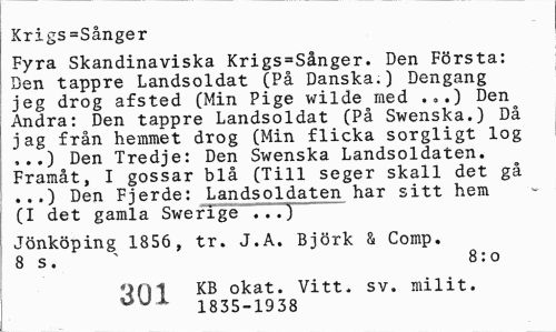 //// Krigs=Sånger //// Fyra Skandinaviska Krigs=Sånger. Den Första: Den tappre Landsoldat (På Danska.) Dengang jeg drog afsted (Min Pige wilde med .».) Den Andra: Den tappre Landsoldat (På Swenska.) Då jag från hemmet drog (Min flicka sorgligt log ,..) Den Tredje: Den Swenska Landsoldaten. Framåt, I gossar blå (Till seger skall det gå ...) Den Fjerde: Landsoldaten har sitt hem (I det gamla Swerige ...) //// Jönköping 1856, tr. J.A. Björk & Comp. 8 s. " 8:0 //// onn KB okat. Vitt. sv. milit. //// OU^ 1835-1938 ////