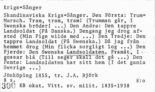 //// Krigs=Sånger //// Skandinaviska Krigs=Sånger. Den Första: Trum= Marsch. Tram, tram, tram.' (Trumman går, I Swenska broderi ,.„) Den Andra: Den tappre Landsoldat (På Danska.) Dengang jeg drog af-sted (Min Pige wilde med ...) Den Tredje: Den tappre Landsoldat (På Swenska.) Då jag från hemmet drog (Min flicka sorgligt log ...) Den Fjerde: Den Swenska Landsoldaten-. Framåt, I < gossar blå (Till seger skall det gå ...) Den Femte: Landsoldaten har sitt hem (I det gamla Swerige ...) //// Jönköping 1855, tr. J.A. Björk B s o 3 * o //// 300 KB okat. Vitt. sv. milit. 1835-1938 ////