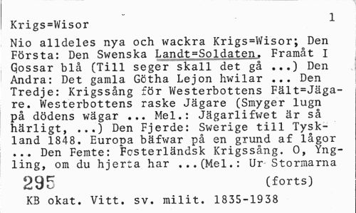 //// Krigs=Wisor * //// Nio alldeles nya och wackra Krigs=Wisor; Den Första: Den Swenska Landt=Soldaten. Framåt I Gossar blå (Till seger skall det gå ...) Den Andra: Det gamla Götha Lejon hwilar ... Den Tredje: Krigssång för Westerbottens Fältjägare. Westerbottens raske Jägare (Smyger lugn på dödens wägar ... Mel.: Jägarlifwet är så härligt, ...) Den Fjerde: Swerige till Tyskland 1848. Europa bäfwar på en grund af lågor ... Den Femte: Fosterländsk Krigssång. 0, Yngling, om du hjerta har ...(Mel.: Ur Stormarna //// 295 (forts) //// KB okat. Vitt. sv. milit. 1835-1938 ////