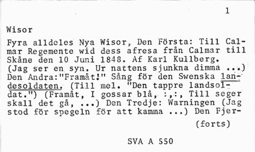 //// 1 //// Wisor //// Fyra alldeles Nya Wisor, Den Första: Till Cal-mar Regemente wid dess afresa från Calmar till Skåne den 10 Juni 1848. Af Karl Kullberg. (Jag ser en syn, Ur nattens sjunkna dimma ...) Den Andra: "Framåt!" Sång för den Swenska lan-' desoldaten. (Till mel. "Den tappre landsoldat.") (Framåt, I gossar blå, :,:, Till seger skall det gå, ...) Den Tredje: Warningen (Jag stod för spegeln för att kamma ...) Den Fjer- //// (forts) //// SVA A 550 ////