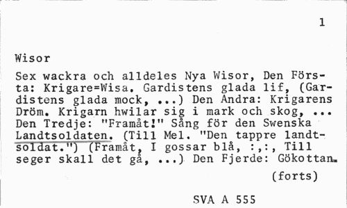 //// 1 //// Wisor //// Sex wackra och alldeles Nya Wisor, Den Första: Krigare=Wisa. Gardistens glada lif, (Gar-distens glada mock, ...) Den Andra: Krigarens Dröm. Krigarn hwilar sig i mark och skog, ... Den Tredje: "Framåt!" Sång för den Swenska Landtsoldaten. (Till Mel. "Den tappre landt-soldat.H) (Tramåt. I gossar blå, :,:, Till seger skall det ga, ...) Den Fjerde: Gökottan, //// (forts) //// SVA A 55 5 ////