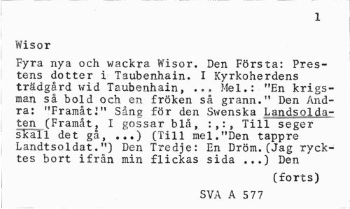 //// 1 //// Wisor //// Fyra nya och wackra Wisor. Den Första: Pres-tens dotter i Taubenhain. I Kyrkoherdens trädgård wid Taubenhain, ... Mel.: "En krigsman så bold och en fröken så grann." Den Andra: "Framåt.*" Sång för den Swenska Landsolda-ten (Framåt, I gossar blå, :,:, Till seger skall det gå, ...) (Till mel."Den tappre Landtsoldat.") Den Tredje: En Dröm.(Jag rycktes bort ifrån min flickas sida ...) Den //// (forts) //// SVA A 577 ////