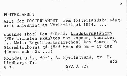 //// 2 //// FOSTERLANDET //// Allt för FOSTERLANDET Fem fosterländska sånger i anledning av Världskriget 1914. ... //// susande skog) Den fjärde: L an ds to rms sången (För friheten skänktes oss vapnen, kamrater ... Mel.: Engelbrektsmarschen) Den femte: Då Stormklockorna gå (Vad båda de om - är det jämmer och nöd ...) //// Mölndal u.å., förl. A. Kjellstrand, tr. B. Lindbergs Tr. 8:0 //// 8 s. SVA A 729 ////