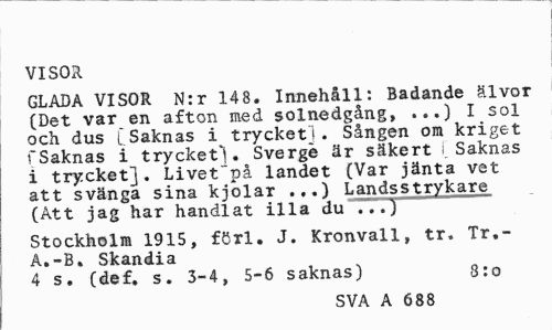 //// VISOR //// GLADA VISOR N:r 148. Innehåll: Badande älvor (Det var en afton med solnedgång, ...) I sol och dus [Saknas i trycket]. Sången om kriget fSaknas i trycket). Sverge är säkert I Saknas i trycket]. Livet på landet (Var jänta vet att svänga sina kjolar Landsstrykare //// (Att jag har handlat illa du ...) //// Stockholm 1915, föxl. J. Kronvall, tr. Tr.-A.-B. Skandia //// 4 s. (def. s. 3-4, 5-6 saknas) 8:o //// SVA A 688 ////