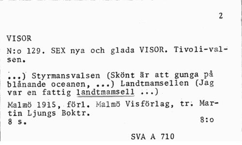 //// 2 //// VISOR //// N:o 129. SEX nya och glada VISOR. Tivoli-val-sen. //// ...) Styrmansvalsen (Skönt är att gunga på blånande oceanen, ...) Landtmamsellen (Jag var en fattig landtmamsell ...) //// Malmö 1915, förl. Malmö Visförlag, tr, Martin Ljungs Boktr. //// 8 s. 8:o //// SVA A 710 ////