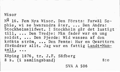 //// Wisor //// N- 16. Fem Nya Wisor. Den Första: Farwäl So-phie, v/i se hwarandra åter, ... Den Andra: Stockholmslifwet. I Stockholm går det lustigt till, ... Den Tredje: Min fader war en ung soldat, ... Den Fjerde: Wid wassen af den krökta ström, ... Den Femte: Hur en Qwarttern förändrar allt. Jag war en fattig Landt"Mamsell, ... //// Köping 1876, tr. J.F. Säfberg 8 s. (i samlingsband) 8:o //// SVA A 506 ////