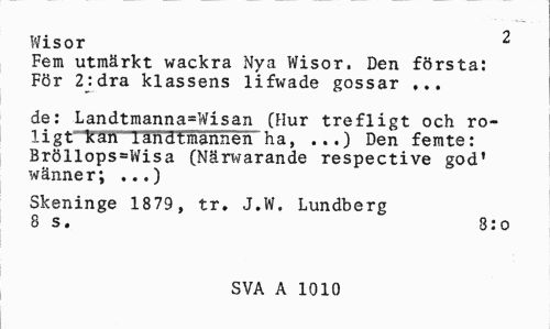 //// Wisor //// Fem utmärkt wackra Nya Wisor, Den första: För 2:dra klassens lifwade gossar ... //// de: Landtmanna=Wisan [Hur trefligt och rolig t^ä!TT5fTTOnannerrha, ...) Den femte: Bröllops=Wisa (Närwarande respective god1 wänner; ...) //// Skeninge 1879, tr. J.W. Lundberg 8 s. 8: o //// SVA A 1010 ////
