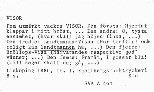 //// VISOR //// Fem utmärkt vackra VISOR® Den första: Hjertat klappar i mitt bröst, ... Den andra: O, tysta ensamhet, (hvar skall jag nöjen finna, ..„) Den tredje: Landtmanna-Visan (Hur trefligt ock roligt kan landtmannen ha, ...) Den fjerde: Bröllops-Visa (Närvarandes rés.pective god"* vänner; ...) Den femte: Framåt, I gossar blål (Till seger skall det gå, ...) //// Linköping 1886, tr. I. Kjellbergs boktryckeri 8 s. 8:0 //// SVA A 464 ////