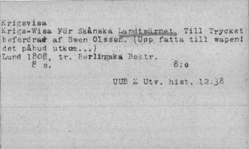 //// Krigsvisa //// Krigs-Wisa För Skånska ^ln;UjfMr''-tl Till Trycket befordrad- af Swen Olssorf. t Upp fatta till wapenl det påbud utkom».,) Lund 1808, tr. Berlimska Boktr. //// 8 a. B:o //// UUB Z Ut v . hi st, 12.38 ////