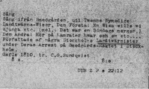 //// ".-¦-V ¦ ¦ -T». • i" <•¦ i- . >, . . . i • , ,irv .; .--..> //// ¦¦ '<< .i ' • ' i v "' //// Sång //// Sång- i från 3m ed gård ert, uti. Twenne Nymod i ge Landtvärns-Wiser, Ben Första: En flsa wille wi sjunga etc. (mélv; Bet war en Söndags morgon,) Ben Andra i Hör på Kamrater hwar och"en etc..,. Författade af några Stockholms t^ard tvärni st er under Be ras Arrest på 3m éd gärd s-ITI^el^f^oTOi» holm. //// Gefle 1610, tr. C.G.Sundqviat //// 8 s. 8: o //// IIUB 2 P 9 22» 12 ////