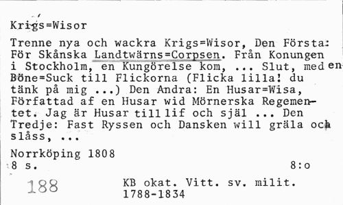 //// . 7 //// Kri;-gs=Wisor //// Trenne nya och wackra Krigs=Wisor, Den Första-För Skånska Landtwärns=Corpsen. Från Konungen i Stockholm, en Kungörelse kom, ... Slut, med en Böne=Suck till Flickorna (Flicka lilla! du tänk på mig ...) Den Andra: En Husar=Wisa, Författad af en Husar wid Mörnerska Regementet. Jag är Husar tilllif och själ ... Den Tredje: Fast Ryssen och Dansken will gräla ock //// S 1 ä S S y • • • //// Norrköping 1808 //// 8 s. 8:o //// po KB okat. Vitt. sv. milit. //// 1788-1834 ////