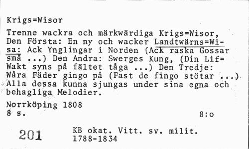 //// Krigs=Wisor //// Trenne wackra och raärkwärdiga Krigs=Wisor, Den Första: En ny och wacker Landtwärns=Wi-sa: Ack Ynglingar i Norden (Ack raskaGossar sma ...) Den Andra: Swerges Kung, (Din Lif= Wakt syns på fältet tåga ...) Den Tredje: Wåra Fäder gingo på (Fast de fingo stötar ...) Alla dessa kunna sjungas under sina egna och behagliga Melodier. //// Norrköping 1808 //// 8 s. 8:0 //// IQ© KB okat. Vitt. sv. milit. //// v 1788-1834 ////