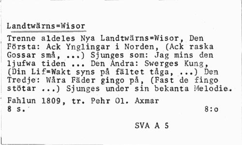 //// L andtwä rns =Wi s o r //// Trenne aldeles Nya Landtwärns=Wisor, Den Första: Ack Ynglingar i Norden, (Ack raska Gossar små, ...) Sjunges som: Jag mins den ljufwa tiden ... Den Andra: Swerges Kung, (Din Lif=Wakt syns på fältet tåga, ...) Den Tredje: Wåra Fäder gingo på, (Fast de fingo stötar ..,) Sjunges under sin bekanta Melodie. //// Fahlun 1809, tr. Pehr 01. Axmar 8 s. 8: o //// SVA A 5 ////