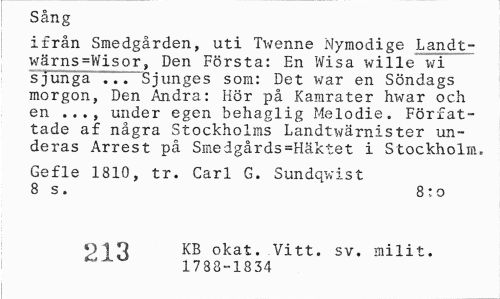 //// Sång //// ifrån Smedgården, uti Twenne Nymodige Landt-wärns=Wisor, Den Första: En Wisa wille wi sjunga "... Sjunges som: Det war en Söndags morgon, Den Andra: Hör på Kamrater hwar och en ..., under egen behaglig Melodie. Författade af några Stockholms Landtwärnister un-deras Arrest på Smedgårds=Häktet i Stockholm. //// Gefle 1810, tr. Carl G. Sundqwist 8 s. 8:0 //// 913 KB okat. Vitt. sv. milit. //// 1788-1834 ////