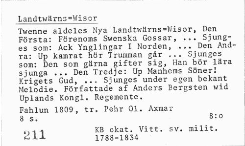 //// Landtwärns=Wisor //// Twenne aldeles Nya Landtwärns=Wisor, Den Första: Förenoms Swenska Gossar, Sjung- //// es som: Ack Ynglingar I Norden, ... Den Andra: Up kamrat hör Trumman går ,.. Sjunges som: Den som gärna gifter sig, Han bör lära sjunga ... Den Tredje: Up Manhems Söner! Krigets Gud, ... Sjunges under egen bekant Melodie. Författade af Anders Bergsten wid Uplands Kongl. Regemente. //// Fahlun 1809, tr. Pehr 01. Axmar 8 s. 8:o //// q < -i KB okat. Vitt. sv. milit. //// ^^ 1788-1834 ////