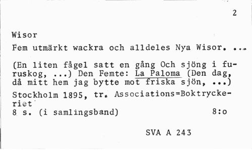 //// 2 //// Wisor //// Fem utmärkt wackra och alldeles Nya Wisor. //// (En liten fågel satt en gång Och sjöng i furuskog, ...) Den Femte: La Paloma (Den dag, då mitt hem jag bytte mot friska sjön, ...) //// Stockholm 1895, tr. Associations=Boktrycke-riet' //// 8 s. (i samlingsband) 8:o //// SVA A 24 3 ////
