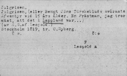 //// Jul griser., //// Julgrisen, (eller Bengt Jpns Törsketiads svåraste kfv/ent^r nic 15 års ålder. En Prästman, lag tror mäst, att det i Lapplarid var..,) //// {av -i. r>. f Le o p o To .) ..."¦*• //// Stockholm 1819, tr. C.%berg. //// 8 B. 8:0 //// F //// Leopold a ////