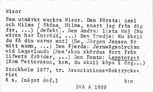 //// Wisor //// Fem utmärkt wackra Wisor. Den Första: Axel och Hilma J Sköna_ Hilma, snart jag från dig far, ...) i^defektj. Den Andra: l:sta Maj (Nu wåren har mträdt, ...) Den Tredje: Nu skall du få din warma mat.' (Se, Jörgen Jensen är mitt namn, ...) Den Fjerde: Jernwägsolyckan wid Lagerlunda (Men'skan skördas fort från lifwets fröjder, ...) Den Femte: Lapptorgejt (Kom Pettersson, kom, du skall köpa i dag...) //// Stockholm 1877, tr. Associations=Boktrycke»,. riet //// 8 s. (något def.) 8:0 //// SVA A 1009 ////