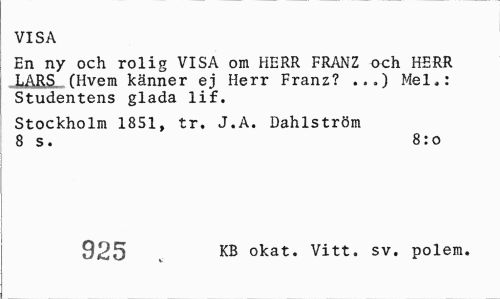 //// VISA //// En ny och rolig VISA om HERR FRANZ och HERR -iiA&SL (Hvem känner ej Herr Franz? ...) Mel,: Studentens glada lif. //// Stockholm 1851, tr. J.A. Dahlström 8 s. 8:0 //// 925 KB okat. Vitt. sv. polem. ////