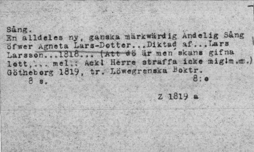 //// - • : • ; ' " .,•> 4 -.A:. ¦ ¦ . . ... "" //// Sång. //// En alldeles ny, ganska siäricwärdig Andelig Sång öfwer Agneta Lars-Dotter,..Diktad af. ..liars LarssonTTTTSIB.T: är raen' skans gifna //// lott/.». mel.: Aekl Herre straffa icke Miglm.ffi.i Götheborg 1819, tr. LÖwegrenska Boktr. 3 8, 8;o //// Z 1819 a ////