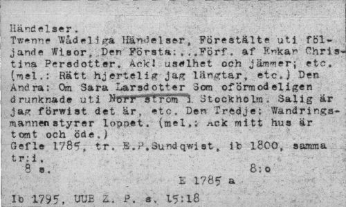 //// Händelser. //// Twenne Wådeliga Händelser, Föreatälte uti följande Wisor» Den Första; ,, .Förf. af Inkan Christina Persdotter, Ack I uselhet och jämmer; etc. (mel.: Rätt hjertelig jag längtar, etc.) Den Andra: Om Sara Larsdotter 3cm ofÖrmodeligen drunknade uti N^rr'"'^Trcm*1 . Stockholm, Salig ar jag förvist det är, etc. Den Tredje: »Vandringsmannen styrer lopnet. (mel,; ^ck mitt hus är t om t och öde.) //// Gefle 1785, tr. E. P.Sund qwi st, ib 18.00; samma t r; i . //// 8 s. 8;o //// £ 1785 a //// Ib 1795. DDE z.. P. s. 15:18 ////