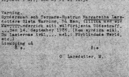 //// Varning. //// Syrderskan och,Torpare-Hustrun Margaretha Lar»-dotter» Sista Waming, Da Hon, tilliKa m»r^Tn .T.undergick sitt wälfortjenta Dödsstraff, . .Den 14. September 1785. (Koia syndiga siäl, Du lasternas träl,... mel.: Förblindade Werld, //// etc.) . . . i .. //// Linköping ua 8 s. //// 0 Larsdotter, M. ////
