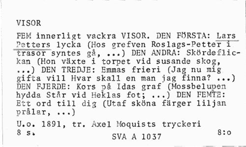 //// VISOR //// FEM innerligt vackra VISOR. DEN FÖRSTA: Lars Petters lycka (Hos grefven Roslags-Petter i trasor syntes gå, ..'.) DEN ANDRA: Skördeflickan (Hon växte i torpet vid susande skog, .,.) DEN TREDJE: Emmas frieri (Jag nu mig gifta vill Hvar skall en man iag finna? ,..) DEN FJERDE: Kors nå Idas graf (Mossbelupen hydda Står vid Heklas fot; ...) DEN FEMTE: Ett ord till dig (Utaf sköna färger liljan prålar, ...) //// U.o. 1891, tr. Axel Moquists tryckeri 8 SVA A 10 37 8:0 ////
