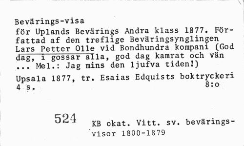 //// Bevärings-visa //// för Uplands Bevärings Andra klass 1877. Författad af den treflige Beväringsynglingen Lars Petter Olle vid Bondhundra kompani (God dag, i gossar alla, god dag kamrat och vän ... Mel.: Jag mins den ljufva tiden!) //// Upsala 1877, tr. Esaias Edquists boktryckeri 4 s. 8:o //// KB okat. Vitt. sv. bevärmgs- //// "visor 1800-1879 ////