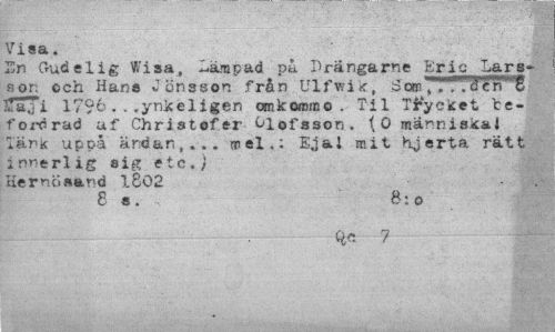//// Visa. //// En Gud cl ig Wisa , Lämpad på Drängarne Kric Larsson och Hans J önsson från Ulf »rik, $ocn,2*cn:""£ STaTi 1796 . . .ynkeligen omkoromo . Til Trycket, te-foz-örad af Christofer Olofsson. (O människa! länk uppå ändan,... mel.: Ejal mit hjerta rätt innerlig sig etc.) Hernöaand 1802 //// 8 s . S: o //// 7 ////