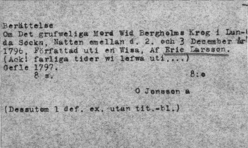 //// Berättelse //// Om Det grufweliga ?jf«rd Wid Berghol»» Krog i Lan- //// e?nclla" å- 2, och 3 December åi 1796, författad uti en Wisa, Af Eric Larsson. //// (Ack! farliga tider wi lafwa uti';1.1.,'}... //// Gefle 1797. //// f ¦ ' , -.; ¦ •¦¦¦ * '.. V." : •¦", "C:.' '¦¦'•'¦• ¦"'•,: ' f- '- '^-"Ir - //// O Jonsson a //// (Dessutom 1 def. ex. utan tit.-bl.) //// ' - ""^"'t ¦ ¦•^'-i ¦ •'-''t*'!":',' ¦•;."¦' ¦^ii/i'' '• ^ ' vy.-.; j . - ". .;;<> •-' ... i- ¦'.'"¦" ////