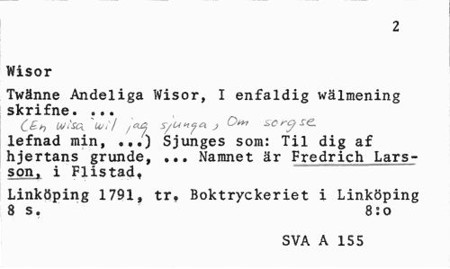 //// 2 //// Wisor //// Twänne Andeliga Wisor, I enfaldig wälmening skrifne. ... //// C£h Wtsa "W/ /«4 S/UHfCL j Oé+1 scryse. lefnad min, ...) Sjunges som: Til dig af hjertans grunde, ... Namnet är Fredrich Lars-son. i Flistad, //// Linköping 1791, tr. Boktryckeriet i Linköping 8 s. 8:o //// SVA A 155 ////