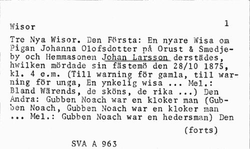 //// Wisor 1 //// Tre Nya Wisor. Den Första: En nyare Wisa om Pigan Johanna Olofsdotter på Orust & Smedje-by och Hemmasonen Johan Larsson derstädes. hwilken mördade sin fäs te mö den 2 8/10 1875, kl. 4 e.m. (Till warning för gamla, till war-ning för unga, En ynkelig wisa ... Mel.: Bland Wärends, de sköns, de rika ...) Den Andra: Gubben Noach war en kloker man (Gubben Noach, Gubben Noach war en kloker man ... Mel.: Gubben Noach war en hedersman) Den //// (forts) //// SVA A 96 3 ////