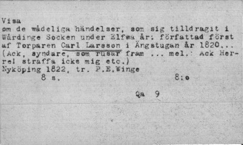//// Visa //// om de wådeliga händelser, sot. sig tilldragit i Wårdinge Socken under iilfwa år; författad först af Torparen Carl Larsson i Angstugan år 1Ö20,.. (Ack, syndare, som rulfST fraai ... mel.* ack Her-r«l straffa icke mig etc.) Nyköping 1822, tr. P.E.Vinge //// 8 s , 8; o //// qa 9 ////