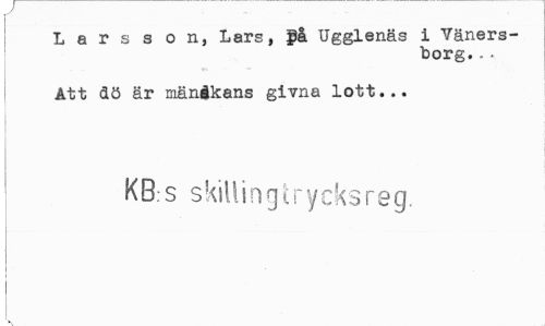 //// Lars s o n, Lars, på Ugglenäs i Vänersborg. . • //// Att dö är mänåkans givna lott... //// KB.-s skillingtrycksreg. ////