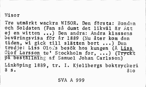 //// Wisor //// Tre utmärkt wackra WISOR. Den första: Bonden och Soldaten (Fan så dumt det likväl är Att ej en witten ...) Den andra: Andra klassens beväringsviSa för år 1839 (Nu åter kom den tiden, wi gick till slätten bort ...) Den tredje: Liss Oloxs besök hos kungen (Å Lj-ss Olof Larsson te1 Stockholm for, ...) (Tryckt på beställning af Samuel Johan Carlsson) //// Linköping 1389, tr. I. Kjellbergs boktryckeri 3 s. 8: o //// SVA A 999 ////